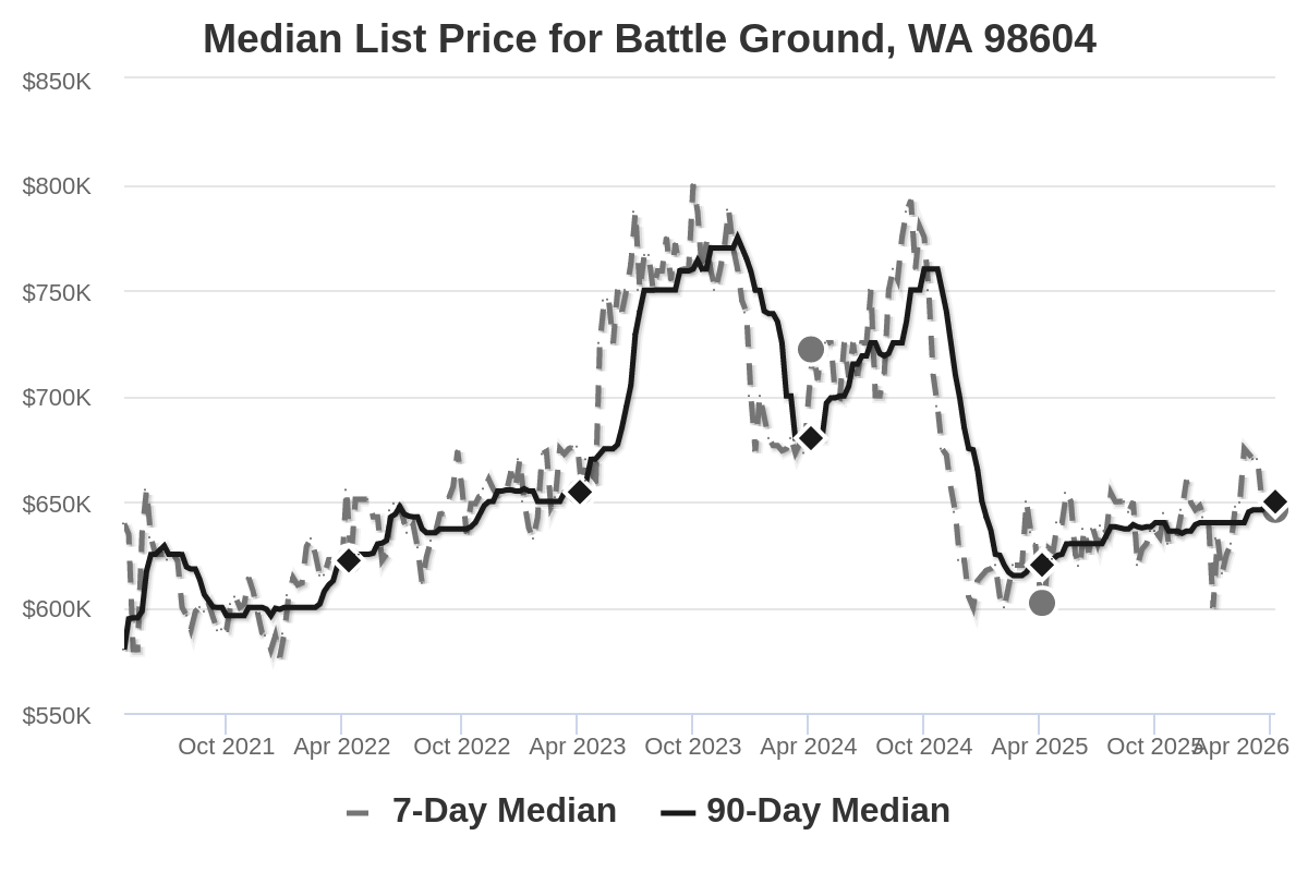 This week the median list price for Battle Ground, WA 98604 is $645,999 with the market action index hovering around 41.