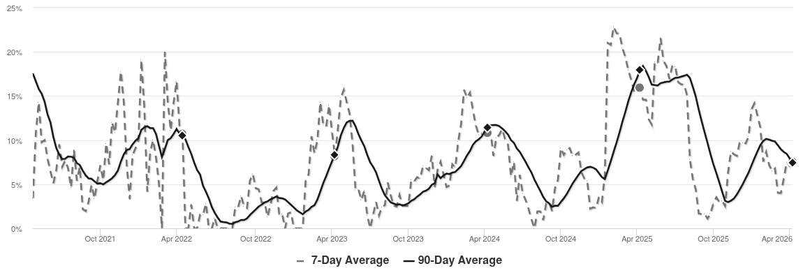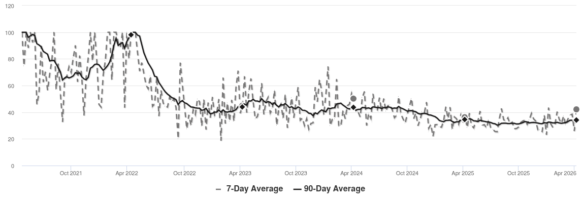 Prices in this zip code hit another all time high this week. You can see that prices continue to march higher. Look for a persistent downtrend in the Market Action Index into the Buyer’s zone as a leading indicator of the price strength finally abating.
