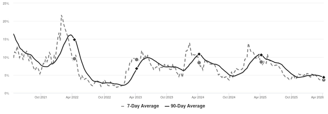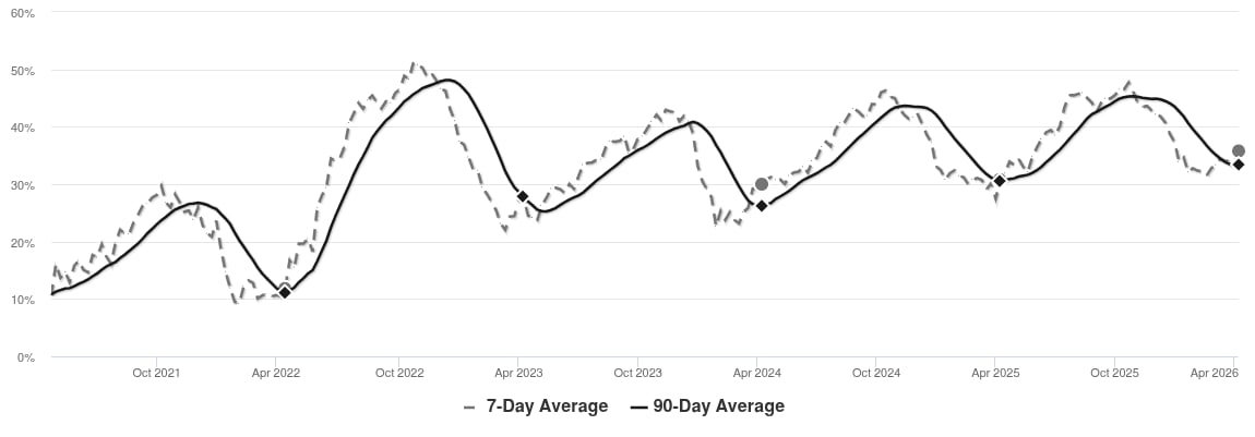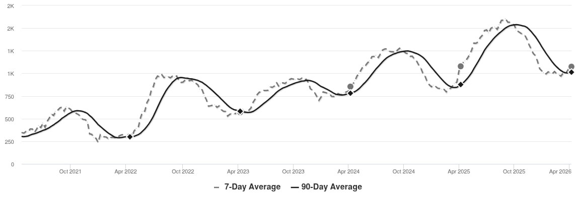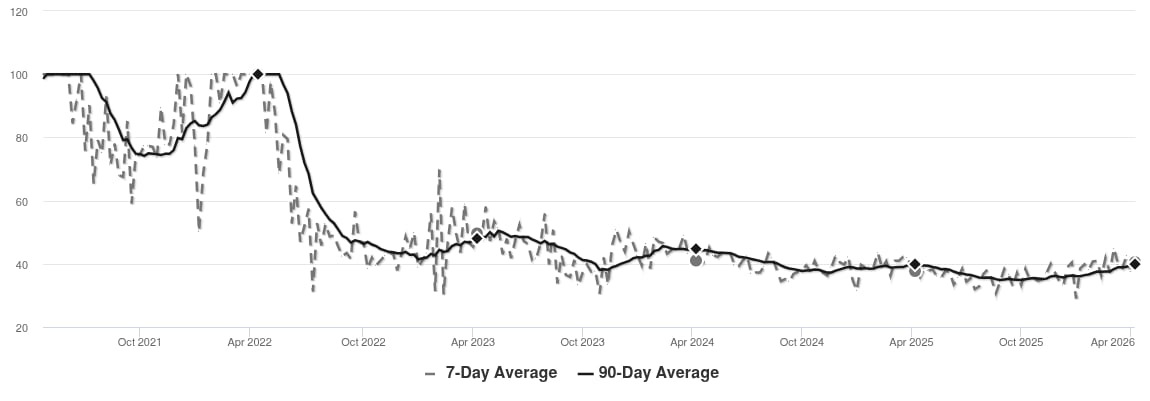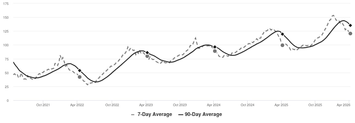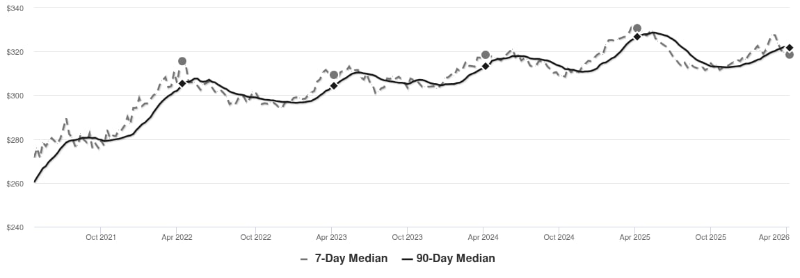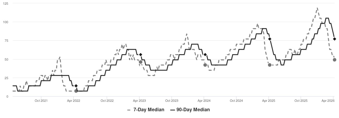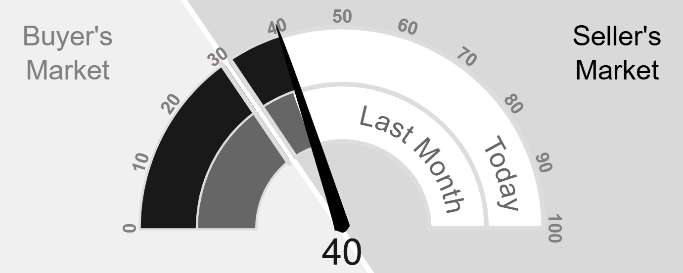 The market has been cooling over time and prices plateaued for a while. Despite the consistent decrease in MAI, we’re in the Seller’s zone. Watch for changes in MAI. If the MAI resumes its climb, prices will likely follow suit. If the MAI drops consistently or falls into the Buyer’s zone, watch for downward pressure on prices.
