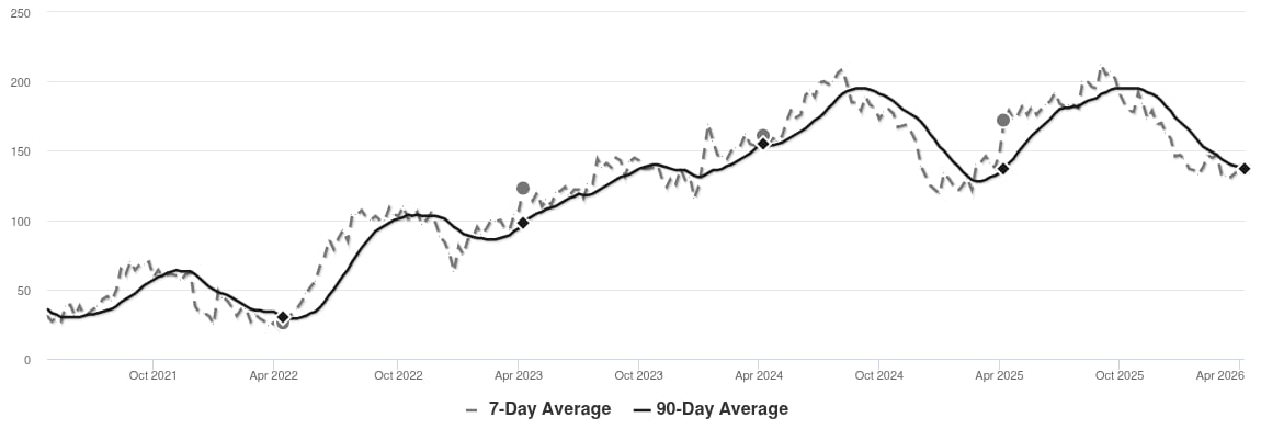 We continue to see prices in this zip code hovering around their high point. Look for a persistent down-shift in the Market Action Index before we see prices deviate from these levels.