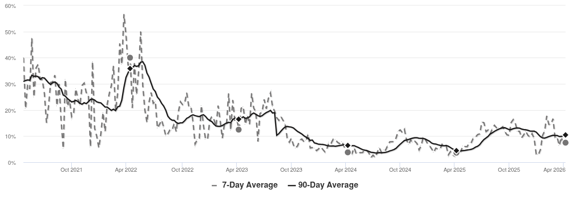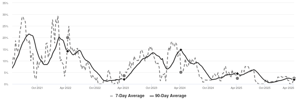 The Market Action Index has been trending lower for several weeks while prices have remained relatively stable. If inventory continues to grow relative to demand however, it is likely that we will see downward pressure on pricing.